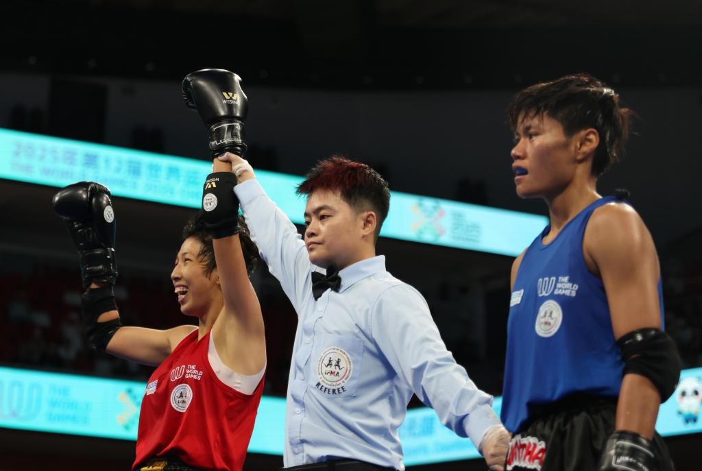 20岁的刘晓慧在女子48公斤级泰拳决赛中,力压泰国选手奥诺克摘得金牌。她将夺冠大半功劳归功于自幼练习太极拳等传统武术,正式打泰拳比赛仅4年,很多时候她依靠中国功夫底子来适应泰拳规则。